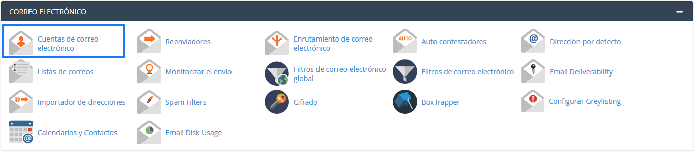 1.- Accede a cPanel y, en la sección «Correo electrónico», pulsa sobre «Cuentas de correo electrónico».